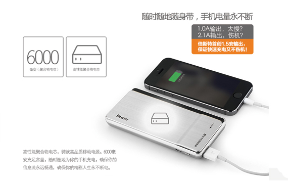 高性能聚合物鋰電芯,鑄就高品質移動電源。6000毫安充足容量,隨時隨地為你的手機充電,確保您的信息流永遠暢通,確保你的精彩人生永不斷電。