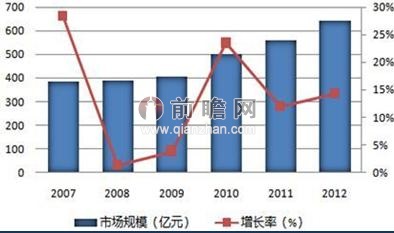 圖表1:2007-2012年我國鋰電池市場規(guī)模(單位:億元,%)