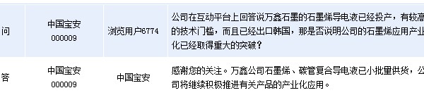周四晚間中國寶安(000009)在全景網互動平臺上表示,萬鑫公司石墨烯、碳管復合導電液已小批量供貨,公司將繼續積極推進有關產品的產業化應用。