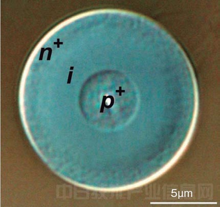 PSU化學(xué)教授John Badding等的研究小組采用以同心圓狀制備p+型、i型及n+型硅半導(dǎo)體的技術(shù),在光纖的核心部分制備了pin結(jié)。具體做法是用高壓化學(xué)氣相沉積法(CVD)向中空的光纖內(nèi)部吹入硅烷(SiH4)氣體,通過溫度控制等使其結(jié)晶而成。