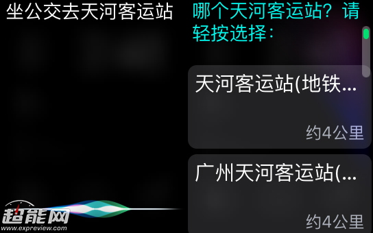 此前Siri最多可以啟動某個應用、記錄筆記,或者使用Siri進行聽寫單詞輸入,不過現在可以實現更多的功能,例如我輸入“坐公交去天河客運站”,它就會彈出幾個可能要的選項,然后繼續(xù)彈出交通工具選項,但因為前面已經識別出“坐公交”,所以系統(tǒng)會自動作出選擇。但現在我這邊的地圖數據一直無法同步到手表上,所以沒辦法看到路線。