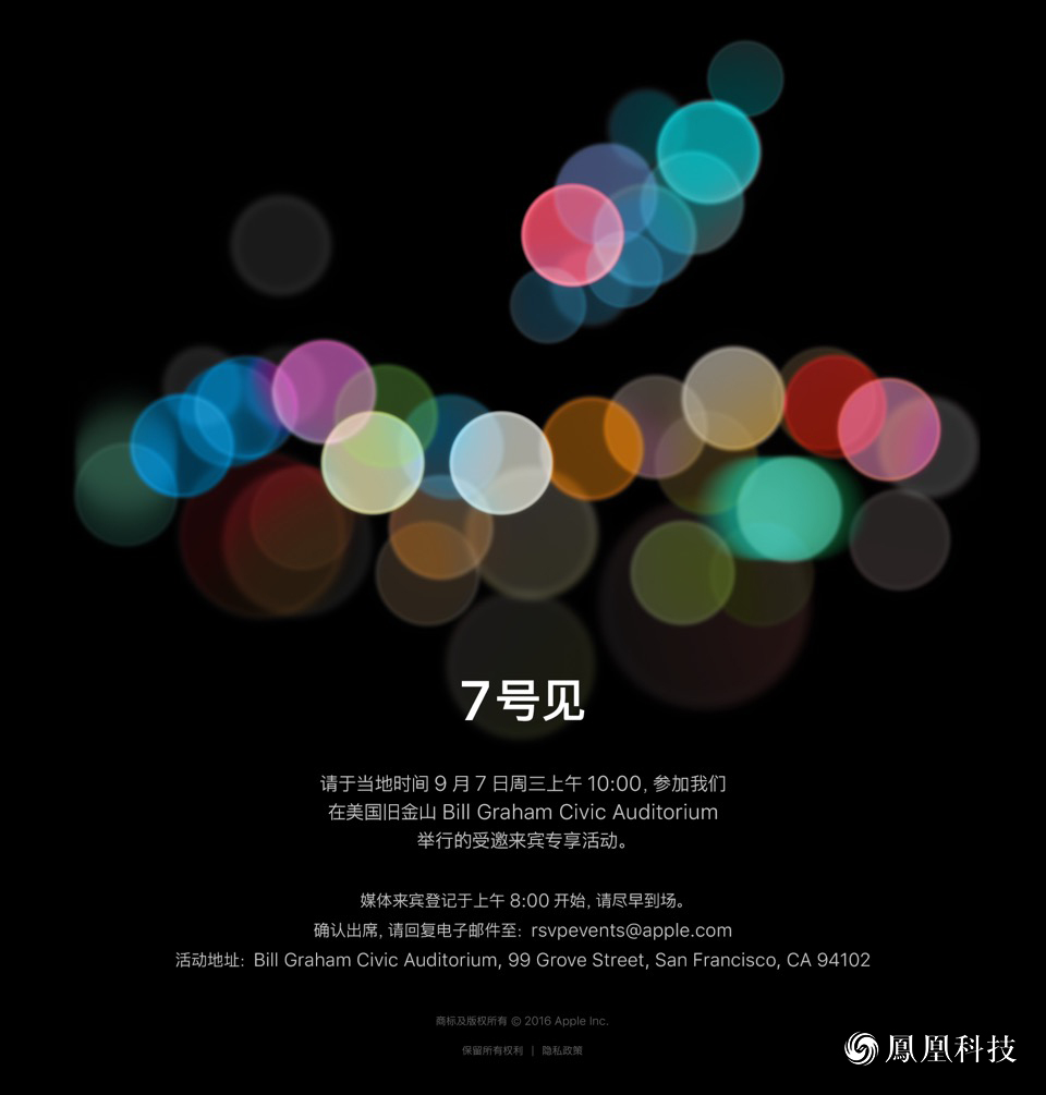 本次蘋果新品發布會邀請函背景為漆黑多彩光斑。看這意思,傳言中的新品iPhone將搭載雙攝像頭估計也沒得跑了。