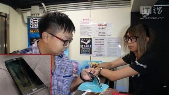 在旺角網吧工作的伍先生,9月29日約7時,將三星Note7用原裝線材放在吧臺充電,其間手機突然狂噴白煙,發出火光,又發出嗞嗞聲,他立刻拔掉充電線,將正在噴白煙的手機擲落地,手機著地仍繼續噴煙,他為防止發生火災立刻開門疏散顧客。其后手機停止冒煙,但地板已被醺黑。
