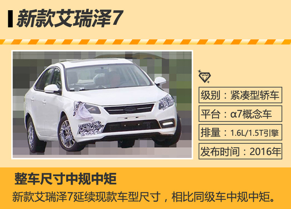 新款艾瑞澤7的定位依然是緊湊型家用轎車,其整車延續了現款尺寸,車長寬高分別為4652/1825/1483mm,軸距為2700mm,相比同級競品顯得中規中矩。據悉,新車有望以2016款艾瑞澤7的命名方式于明年上半年上市銷售。