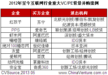 第三,自去年以來,中概股赴美上市窗口基本關閉,2011年下半年僅土豆網、2012年僅唯品會、歡聚時代實現IPO,今年暫無企業登陸美國資本市場。上市窗口受阻,大量的投資機構因基金面臨存續到期迫切希望尋求多元化退出方式。根據ChinaVenture投中集團統計,2012年至今共有24家機構通過13筆互聯網行業并購交易實現退出,雖然并購退出未能達到IPO退出的高額回報,卻成為目前國內投資機構越來越青睞的退出方式(見表3)。