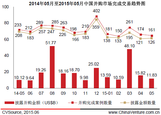 圖2 2014年05月至2015年05月中國(guó)并購(gòu)市場(chǎng)完成交易趨勢(shì)圖