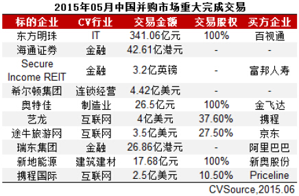 表2 2015年05月中國(guó)并購(gòu)市場(chǎng)重大完成交易