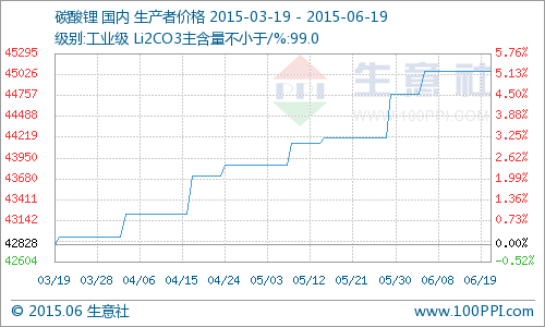 5月國內工業級碳酸鋰行情階梯狀上揚 同比去年上漲15.47%