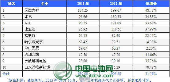 2012年中國(guó)鋰離子電池電芯企業(yè)前10強(qiáng)(以產(chǎn)銷量計(jì))     單位:萬(wàn)kWh