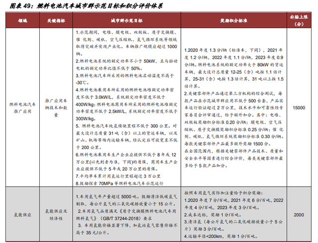 2020 年 9 月,財政部、工業和信息化部、科技部等 5 部門聯合發布了《關于開展燃料電池汽車示范應用的通知》,明確燃料電池汽車示范期間,將采取“以獎代補” 方式,對入圍示范的城市群按照其目標完成情況給予獎勵。