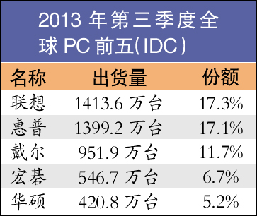 Gartner發(fā)布的數(shù)據(jù)顯示,2012年第三季度聯(lián)想在全球PC市場所占份額為15.7%,銷量為1377萬臺,排在全球第一,這是該公司歷史上首次成為全球PC老大。而惠普所占份額為15.5%,銷售量為1355萬臺,排名第二,這是惠普自2006年第三季度以來首次喪失市場冠軍寶座。
