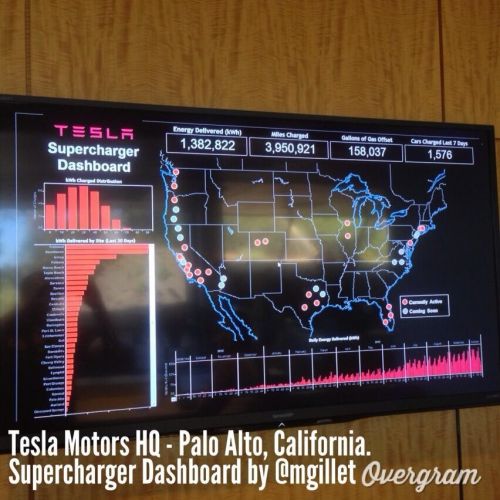 顯示屏中標(biāo)示出了美國(guó)所有正在和等候中的超級(jí)充電站位置,以及許多其他相關(guān)信息。圖中顯示出上周的主要充電信息,包括總輸電量:1382822千瓦時(shí)、充電里程:3950921英里、節(jié)油當(dāng)量:158307加侖、前7天充電汽車(chē)數(shù)量:1576輛。
