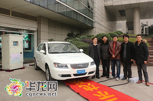 重慶大學(xué)自動(dòng)化學(xué)院電動(dòng)汽車無(wú)線充電技術(shù)研發(fā)團(tuán)隊(duì)與產(chǎn)品(紅色部分為無(wú)線充電導(dǎo)軌)。 通訊員 胡新 攝