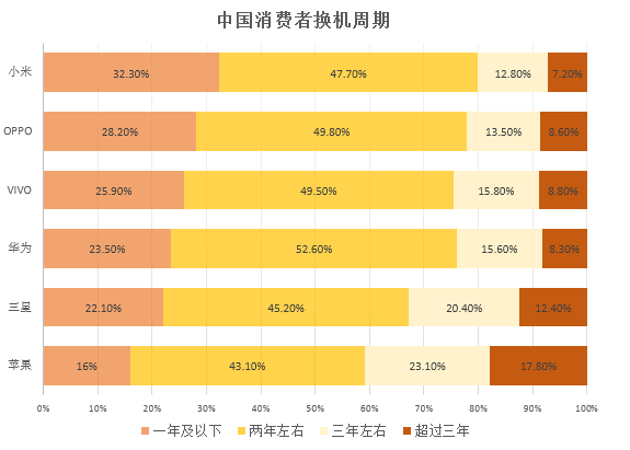 同時,對手機需求的分析還需考慮消費者固定的換機需求。下圖是中國消費者對各品牌手機的換機頻率。