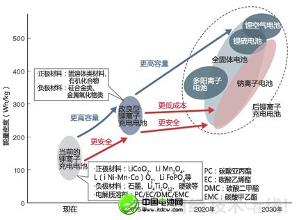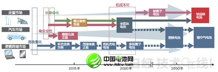圖2:計劃2020年實現300Wh/kg的能量密度 目前推進的材料開發的目標是,2020年在確保安全性的同時使能量密度達到300Wh/kg。2030年使Li-S電池和鋰空氣電池等500Wh/kg以上的新一代電池實現實用化。 |