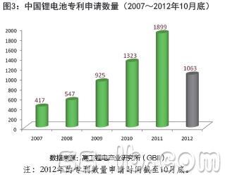 2007年中國鋰電池相關技術專利申請僅有417項,而到了2011年相關技術專利申請達到1899項,是4年前的4.5倍(圖3)。雖然2012年前10個月的專利數量有所下滑,但其總數超過1000件,幾乎是日本、韓國、美國等所有其他國家鋰電池技術專利的總和。