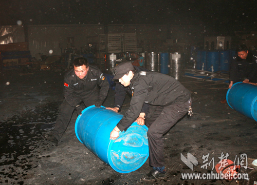澴城派出所值班民警和聯(lián)勤隊(duì)員在全力轉(zhuǎn)運(yùn)塑料桶裝的易燃物。通訊員 宋俊初 攝