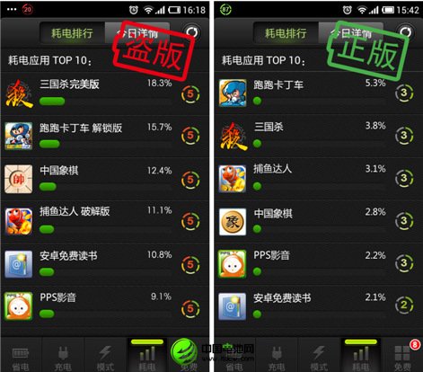 金山電池醫生耗電排行榜顯示,被修改后的盜版應用相比與正版耗電增加數倍