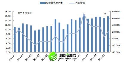 從2012年2月份開始,鉛酸電池已經改變2011年5月份以來的同比負增長趨勢,12月份,同比增長為21.72%。我們認為隨著整頓的持續以及鉛酸電池市場規模的持續擴大,龍頭企業的規模和市場份額有望進一步提升。