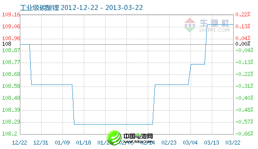 3月22日工業(yè)級碳酸鋰商品指數(shù)為109.08,與昨日持平,較周期內(nèi)最高點(diǎn)112.10點(diǎn)(2012-11-04)下降了2.69%,較2012年01月05日最低點(diǎn)98.94點(diǎn)上漲了10.25%。(注:周期指2011-09-01至今)