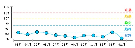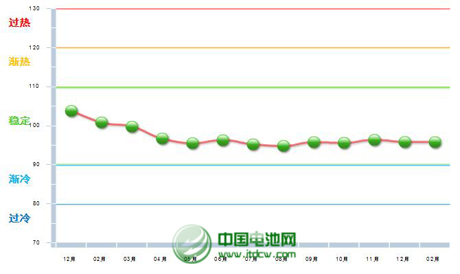 2月份中輕景氣指數(shù)為95.81,位于“穩(wěn)定”區(qū)域。中輕景氣指數(shù)跨年度連續(xù)11個月位于“綠燈區(qū)”中心線以下。