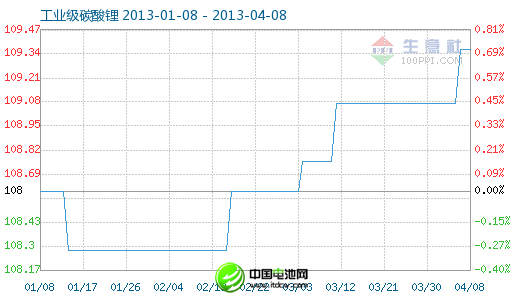4月8日工業(yè)級碳酸鋰商品指數(shù)為109.37,與昨日持平,較周期內(nèi)最高點112.10點(2012-11-04)下降了2.44%,較2012年01月05日最低點98.94點上漲了10.54%。(注:周期指2011-09-01至今) 工業(yè)級碳酸鋰商品指數(shù)