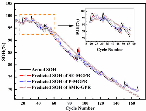 他們還創(chuàng)新性地提出了一種多尺度高斯過程模型框架,它能解耦全局的容量衰減趨勢以及局部的容量再生與波動(dòng),可同時(shí)實(shí)現(xiàn)鋰離子電池SOH的短期和長期精確預(yù)測,為電池的荷電狀態(tài)(SOC)估計(jì)和剩余可用壽命(RUL)預(yù)測奠定了堅(jiān)實(shí)的理論和方法基礎(chǔ)。運(yùn)用所提出的方法對(duì)美國宇航局(NASA)艾姆斯卓越預(yù)測中心三款標(biāo)準(zhǔn)電池?cái)?shù)據(jù)進(jìn)行擬合,結(jié)果表明可自適應(yīng)地解構(gòu)鋰離子電池的長期容量衰減、短期容量再生和波動(dòng)等多種類型的趨勢,極大提高了模型的預(yù)測性能。