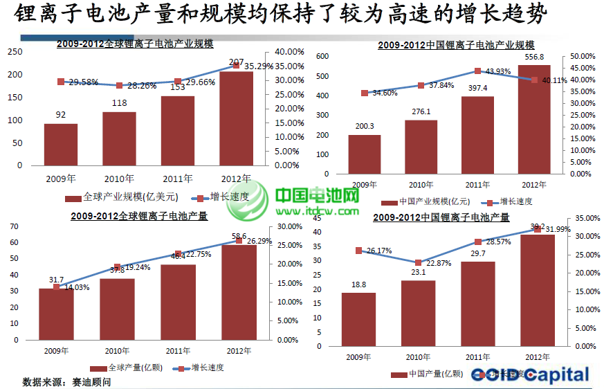 賽迪顧問數據顯示,2012年全球鋰電池行業仍實現高速增長,全球市場規模達到207億美元,增長35.29%;中國市場產業規模達到556.8億元,增長40.11%;2012年全球鋰電池產量實現58.6億顆,增長26.29%;中國鋰電池產量實現39.2億顆,增長31.99%。