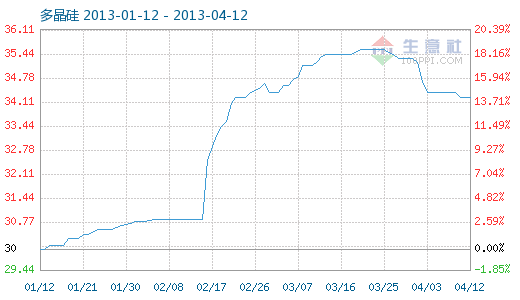 4月12日多晶硅商品指數為34.25,與昨日持平,較周期內最高點100.00點(2011-09-08)下降了65.75%,較2012年12月24日最低點29.12點上漲了17.62%。(注:周期指2011-09-01至今) 多晶硅商品指數自2013-3-25起,