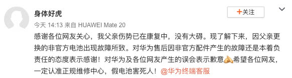 網(wǎng)友@身體好虎還特意發(fā)文稱:“感謝各位網(wǎng)友關心,我父親傷勢已在康復中,沒有大礙?,F(xiàn)了解下來,因父親更換的非官方電池出現(xiàn)故障所致。對華為售后因非官方配件產(chǎn)生的故障還是本著負責任的態(tài)度表示感謝!對華為及各位網(wǎng)友產(chǎn)生的誤會表示歉意希望各位網(wǎng)友,一定認準正規(guī)維修中心,假電池害死人!”