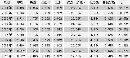 2001年-2010年有關(guān)國家或地區(qū)石墨電極需求全球市場比例