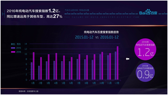 這一點在百度指數最新發布的《2016汽車成長報告》中可見一斑,汽車行業的搜索指數為82億,同比增長僅為2%;而對電動車,雖然搜索指數的絕對值僅為1.2億(其實較真實地反映了純電動車的市場占比情況),卻同比增長達到了27%。電動車市場確實在蠢蠢欲動。