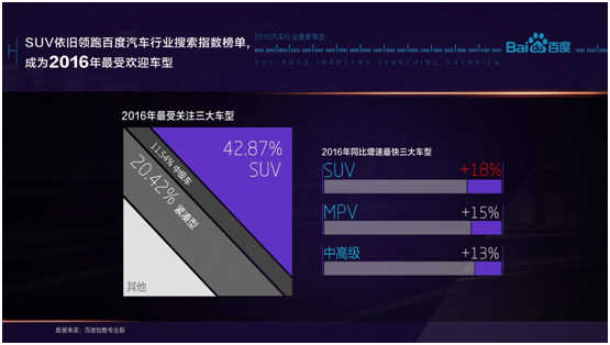 回到快速增長電動車的市場,從乘聯會的數據來看,在目前的電動車市場A00級一直占據不可動搖的主導地位,但其聚集著8成以上電動車廠商和產品,競爭異常激烈。同時,百度指數報告指出SUV在用戶中的關注度達到了42.8%,而這其中自主品牌SUV的關注增速又達33%,一向深受國人喜愛的SUV必定在不遠的未來在也在電動車市場快速增長,傳統車SUV的白熱化競爭將重現。再者,Tesla這樣的高性能電動車隨著蔚來、Karma這樣的新晉玩家的進入,也不會再是獨角戲的繼續。