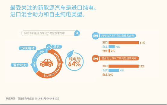 在2014年百度搜索中網(wǎng)民對新能源汽車搜索量增長108%,而國內(nèi)新能源汽車的銷量也達到270%的增量。該現(xiàn)象表明,在國內(nèi)環(huán)保觀念日益加強、各地良好政策相繼落實的背景下,中國消費對新能源汽車的認可度正在逐漸提升,新能源汽車或?qū)Ⅰ側(cè)敫咚偻ǖ馈?/div>