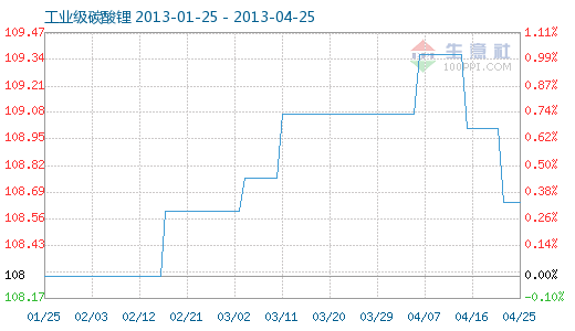 4月25日工業(yè)級碳酸鋰商品指數(shù)為108.64,與昨日持平,較周期內(nèi)最高點112.10點(2012-11-04)下降了3.09%,較2012年01月05日最低點98.94點上漲了9.80%。工業(yè)級碳酸鋰商品指數(shù)自2013-4-14起,12天陸續(xù)下降了0.667%。