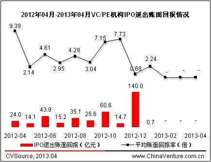 圖4 2012年04月-2013年04月VC/PE機構(gòu)IPO退出賬面回報情況