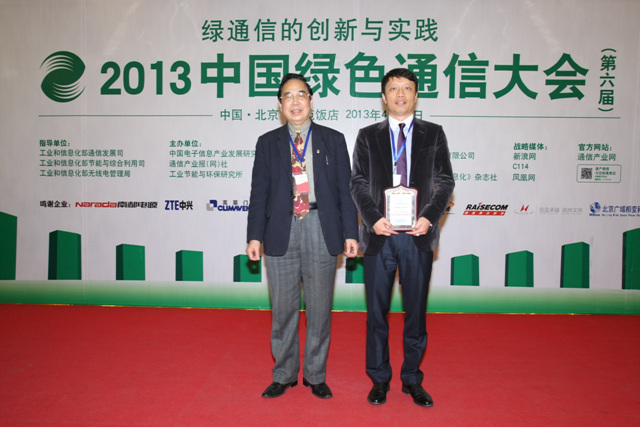 南都電源榮獲“2013年度中國綠色通信創新金獎”,公司總工程師吳賢章領獎