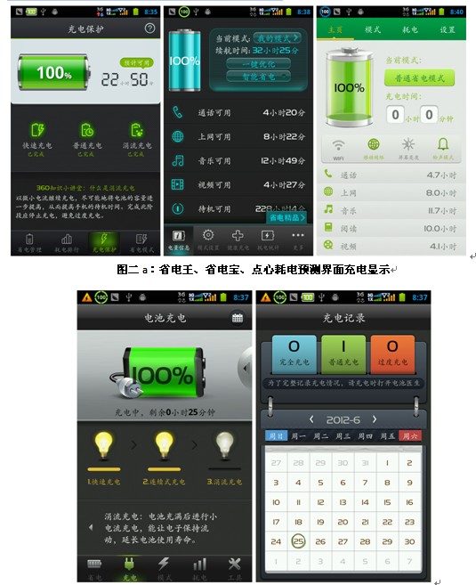 注:為了保證用參與軟件統(tǒng)計(jì)數(shù)據(jù)的可信度,分別選用金山電池醫(yī)生和省電寶典電量統(tǒng)計(jì)功能,取二者區(qū)間作為比較依據(jù)。