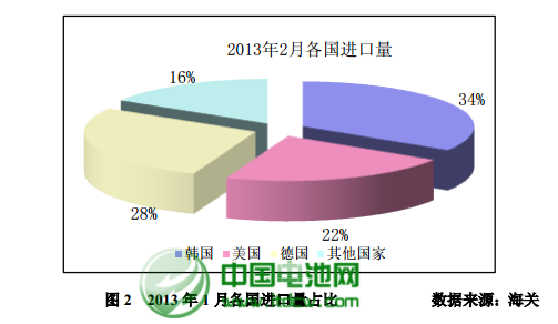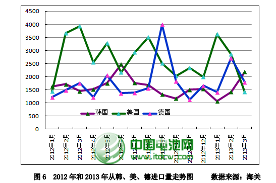 據 3 月份分國別進口數據顯示,韓國、美國和德國是三家最大的進口國家,自韓國、美國、德國進口量占總進口量的 83.67%。其中從韓國進口量為 2184 噸,占總進口量的 33.95%,是除 2012 年 1 月和 6 月外進口量又一次超過美國和德國,位居榜首;從美國進口量為 1410 噸,占總進口量的 21.91%;德國進口量為 1789噸,占總進口量的 27.8%;其他地區進口量為 1051 噸,僅占總量的 16.3%。從進口單價來看,韓國 19.88 美元/千克、美國 13.34 美元/千克、德國 23.16 美元/千克。