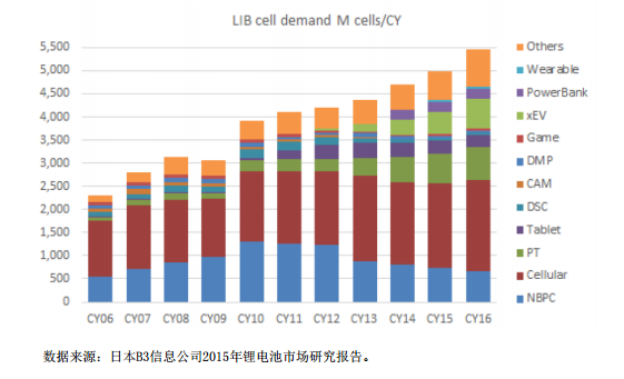 此外,日本B3信息咨詢公司2015年發(fā)布的鋰電市場(chǎng)分析報(bào)告顯示,以鋰電池電芯數(shù)量出貨量計(jì)算,2015年全球鋰電同比增長(zhǎng)約11.02%,考慮到單顆電芯的容量穩(wěn)定上升及動(dòng)力鋰電的迅速發(fā)展,過去十年,鋰電正極材料行業(yè)保持了24%的復(fù)合增長(zhǎng)率,2015年鋰電正極材料出貨量達(dá)到15.4萬(wàn)噸。鋰電池在智能手機(jī)、電動(dòng)工具、電動(dòng)汽車等應(yīng)用領(lǐng)域發(fā)展樂觀。2006年~2016年鋰電池應(yīng)用領(lǐng)域發(fā)展趨勢(shì)見下圖:
