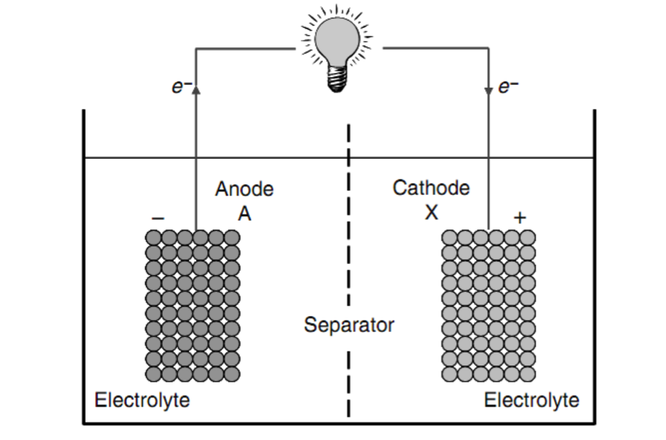 原電池示意圖。陽(yáng)極(Anode)與陰極(Cathode)與外電路連接,浸泡在電解液中,電池工作時(shí),電流從陰極流向陽(yáng)極。因此此處,陽(yáng)極和負(fù)極是同一電極,陰極與正極是同一電極。圖片來(lái)源:Arumugam Manthiram, Smart Battery MaterialsIn, CRC Press, 2009, pp. 8.