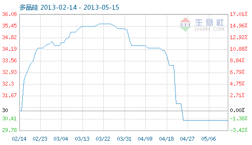 5月14日多晶硅商品指數(shù)為30.31,與昨日持平,較周期內(nèi)最高點(diǎn)100.00點(diǎn)(2011-09-08)下降了69.69%,較2012年12月24日最低點(diǎn)29.12點(diǎn)上漲了4.09%。