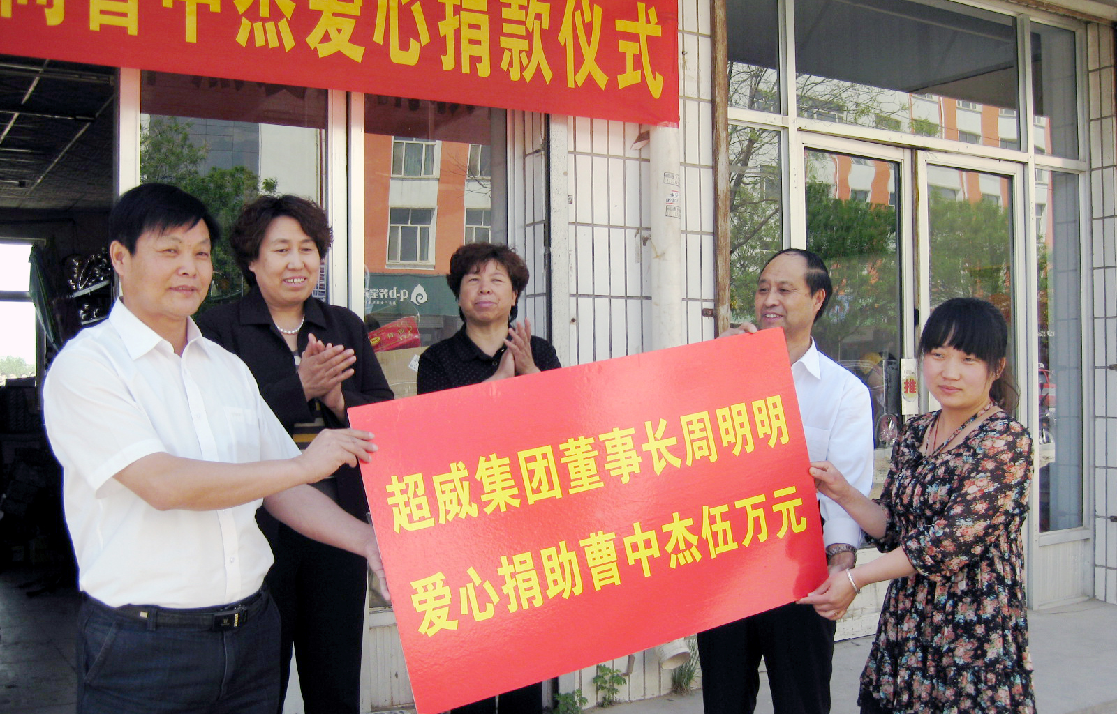 去年11月22日,超威集團領導得知山西廣靈代理商曹中杰患病急需手術治療,家庭特別困難時,當日下午,超威集團黨委就立即開展了愛心捐助活動,集團黨委書記、總裁楊新新帶頭捐款,現場共收到捐款11750元。黨員的愛心捐助行動感動了集團廣大員工,一場大愛行動在全國各地的代理商中匯成了愛的潮流。截止去年11月30日,共收到捐款40510元。