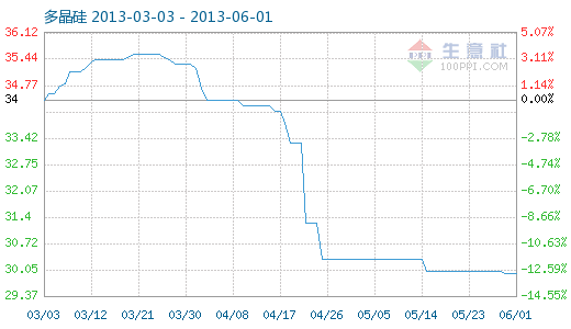 6月1日多晶硅商品指數(shù)為29.94,與昨日持平,較周期內(nèi)最高點100.00點(2011-09-08)下降了70.06%,較2012年12月24日最低點29.12點上漲了2.82%。 日期 03-03 03-12 03-21 03-30 04-08 04-17 04-26 05-05 05-14 05-23 06-01 商