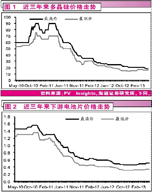 近日歐盟委員會同意向進口自中國的太陽能組件征收懲罰性關稅,該投票結果將于6月6日起宣布,稅率平均為47%。悲觀者認為歐盟的新一輪“雙反”一次性將提高近5成的關稅,必然會給本身毛利率僅為個位數的中國光伏企業給予沉重打擊,經濟復蘇漫漫無期,更別提什么拐點了。但樂觀者則認為由于“雙反”終裁于2013年年末出臺,中國政府仍有足夠的時間和空間進行協商,所以6月初揭曉的結果反而有靴子落地的效果。而據PV insights的樣本統計,在“雙反”公布前夕,光伏市場產品價格波動并不大,PV級、二級多晶硅價格雖然同比略降,但中下游電池片、組件價格卻是小幅上漲,表明市場觀望情緒濃厚。