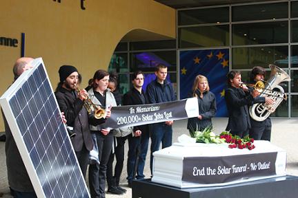 這場由代表著歐洲580多家光伏企業的行業協會——歐洲平價太陽能聯盟舉辦的特殊“葬禮”,是為了“悼念”因歐盟委員會可能對中國光伏產品征收懲罰性關稅而失去的歐洲就業崗位。