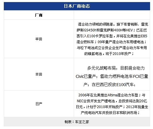 日本汽車廠商鋰電池開發較早,且投入較大,多數由企業已與電池生產企業進行技術層面合作,在混合動力汽車和電力汽車領域處于領先地位。
