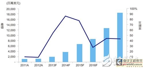 圖1 2011~2018年全球穿戴式設備產(chǎn)值分析 資料來源:拓墣(08/2013)