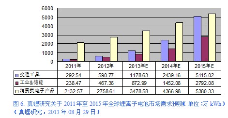 真鋰研究預測,2015年全球鋰離子電池市場規模將達到13,287.43萬kWh,是2011年的近5倍(見圖6),年均復合增長率將高達49.45%。真鋰研究預計,2015年,包括電動自行車、xEV(包括HEV、PHEV和EV)在內的交通工具市場對鋰離子電池的需求總量就將接近消費類電子產品市場,而在2018年至2020年間,工業&儲能市場對鋰離子電池的需求總量也將接近或超過消費類電子產品市場。