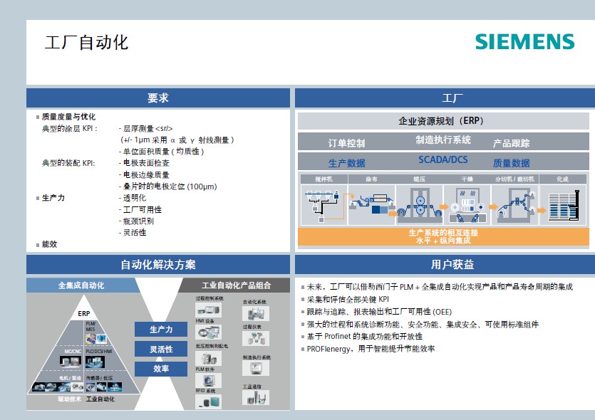 西門子可通過橫跨此領(lǐng)域完整價(jià)值鏈的全面解決方案產(chǎn)品線,來促進(jìn)高效大規(guī)模的電池生產(chǎn)。從自動化與驅(qū)動技術(shù),直至生產(chǎn)規(guī)劃和設(shè)計(jì)軟件,我們可以幫助客戶對電池生產(chǎn)過程中的每一工序進(jìn)行優(yōu)化。
